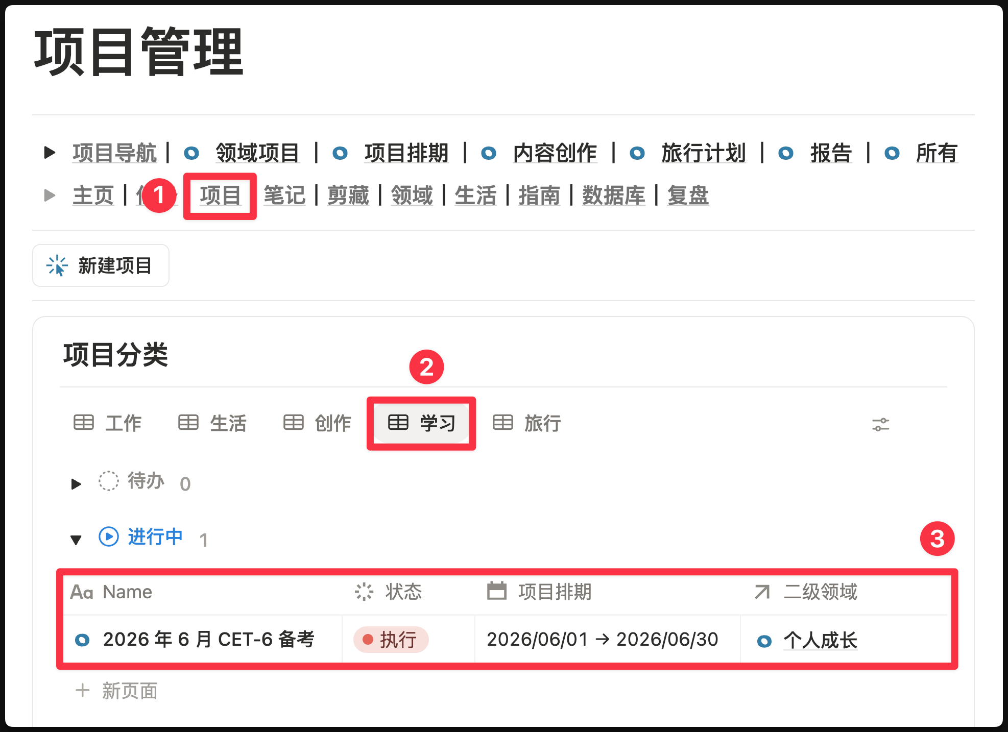 - 你可以在这个领域下创建多个项目(课程 A、课程 B、刷题计划)