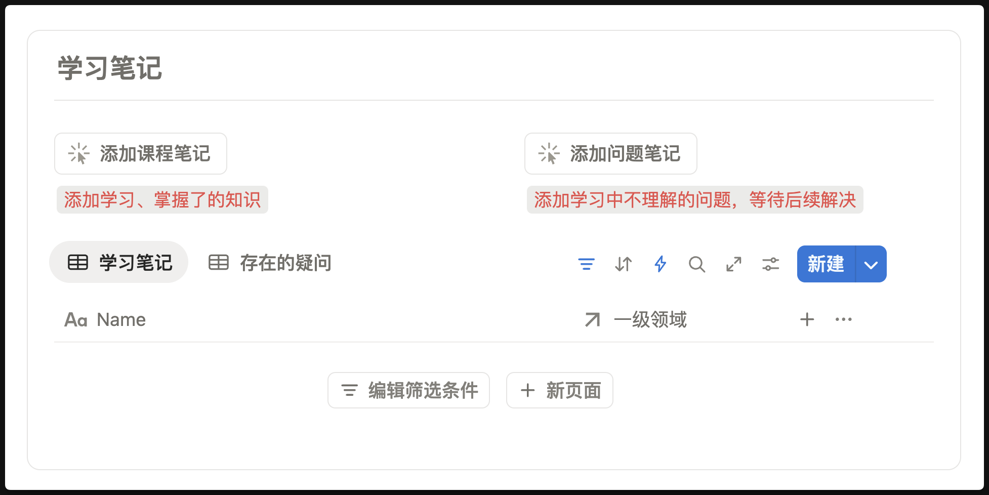 从顶部导航栏进入【项目】中心,然后在【项目分类 - 学习】这个数据库视图中,新建一个页面