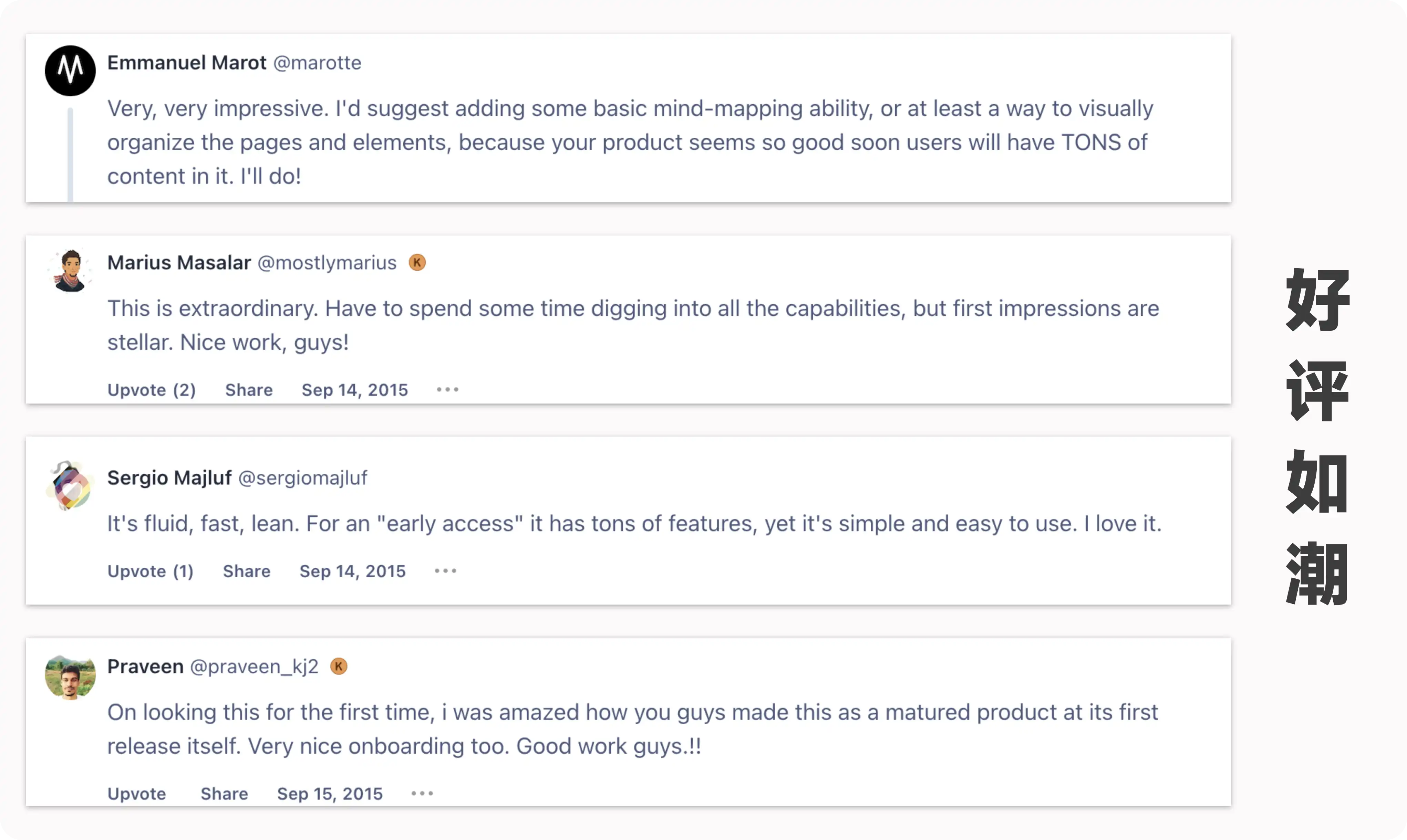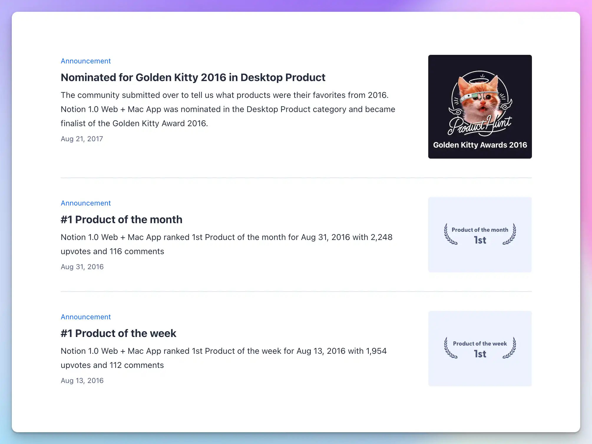Notion 以此获得了几乎所有种子用户的一致好评,在当天的 Product Hunt 排行榜上获得了前三的票数。