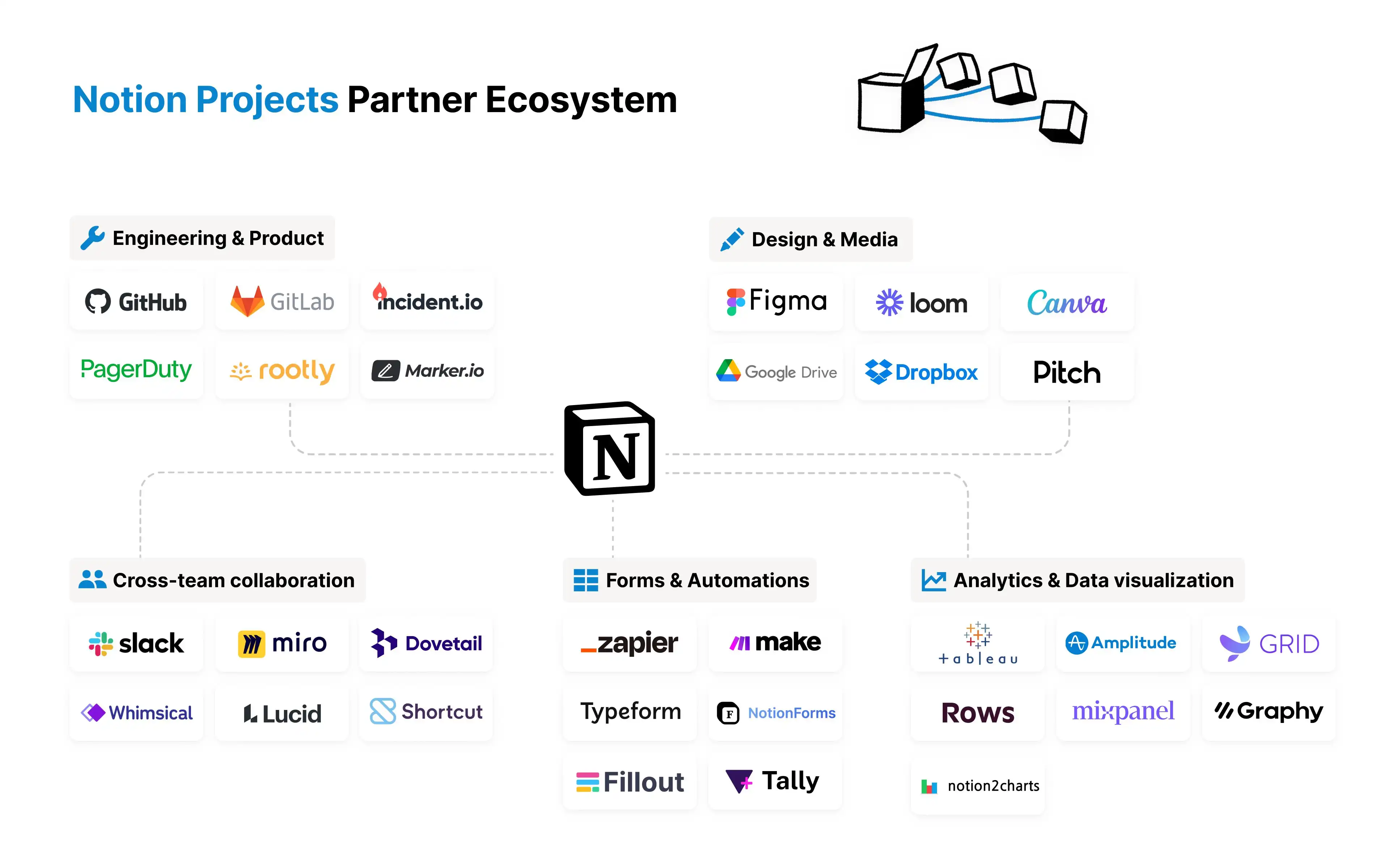 下图是 Notion 今年 6 月 1 号在 Twitter 上公布的生态联动版图,联动的几乎都是国际知名的重量级工具或平台,不知不觉间 Notion 从一个纯粹优雅的文本编辑器,已经成长到如今这般「雄壮」的姿态,虽然估值不一定是最高,但 Notion 一定是生态圈里最自由、可塑性最高的那一个。