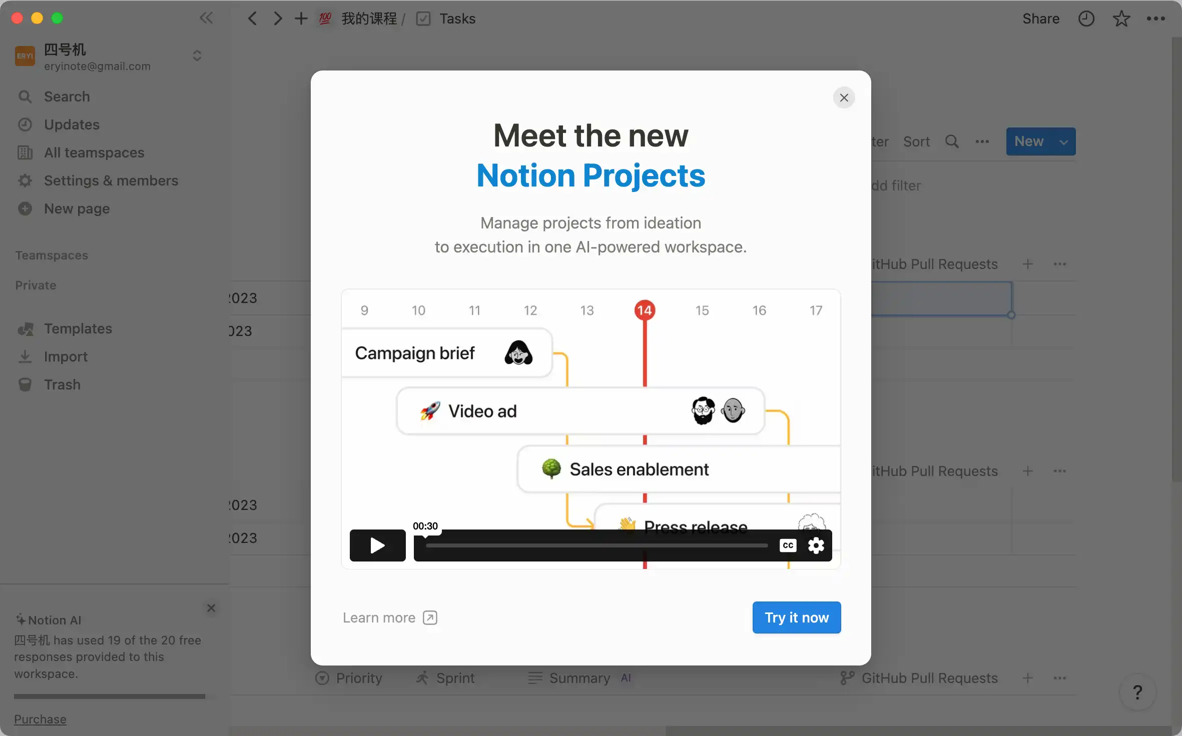 但这次是 Notion 官方少有的以指导性的官方口径、以弹出式的窗口宣传来强调自己**「能够做团队项目管理」**这件事。并且它的项目管理不是数据私有,不是闭门造车,而是找到所有能够联合的强大伙伴,然后为它们提供能够尽情发挥能力的巨大舞台。