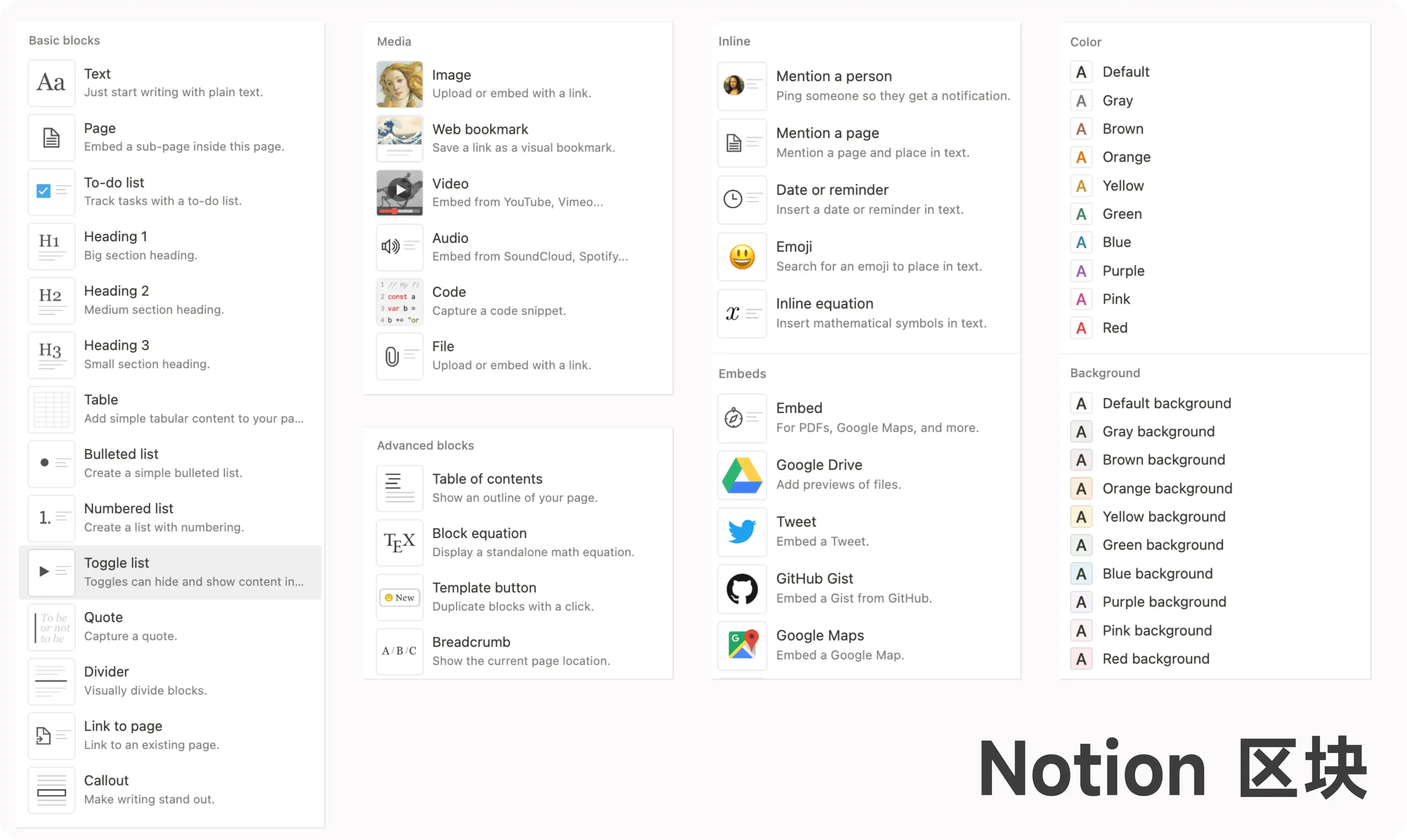 就像乐高积木一样,在 Notion 中,各种功能的实现都依赖于一个个的区块(Block),包括「页面」本身。这些区块被收纳进了 Noiton 的命令菜单/ 里,不会因为内嵌繁多的功能给到你压力,只要在你需要用到它的时候再调用出来即可。