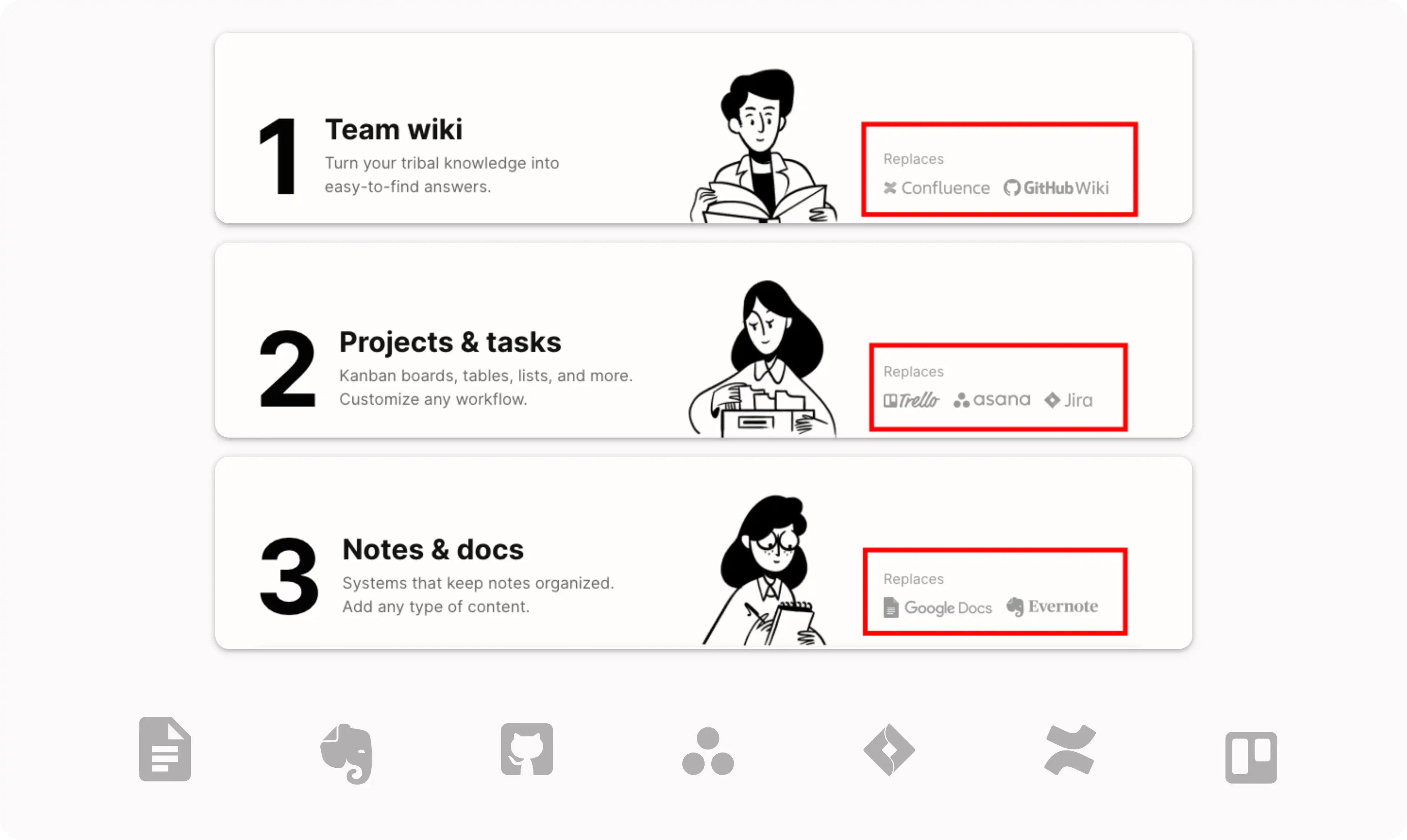彼时专注个人笔记的 Evernote 如日中天,Asana 的任务管理独占一方市场,而企业端的知识库则以 Confluence 为代表,所以 Notion 旗帜鲜明亮出了自己的野心——我们将用一款产品来替代他们所有,All in one 的口号第一次喊得如此响亮。
