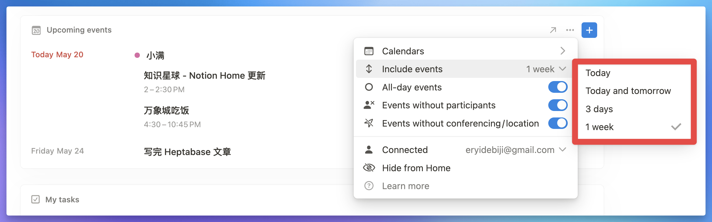在这个「Upcoming events」模块中,只会显示即将到来的日程,可选的时间范围包括今天、今天与明天、3 天内、一周内