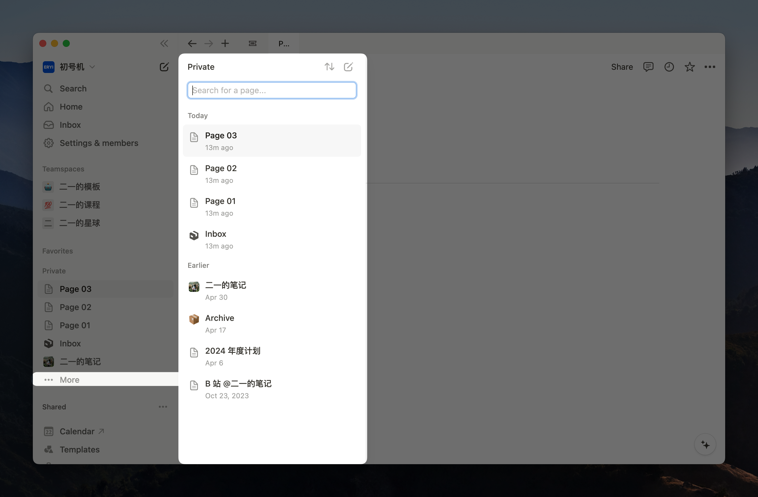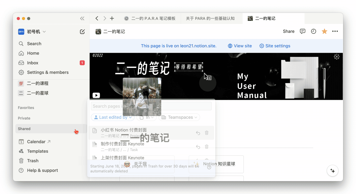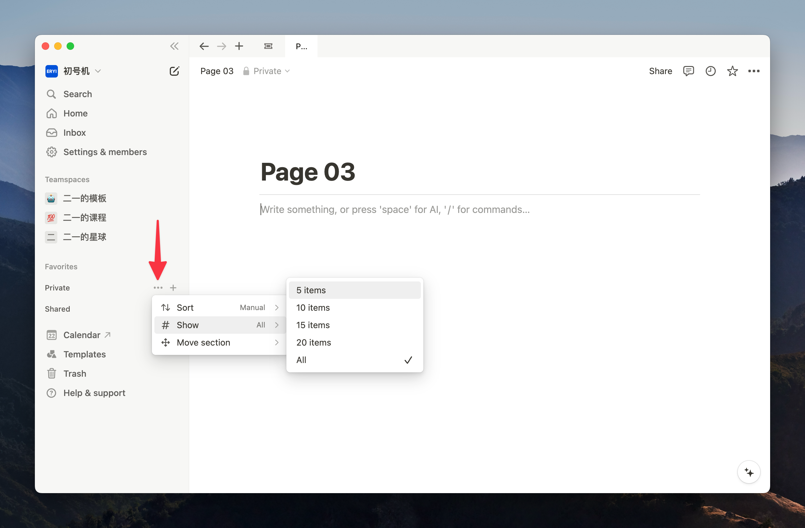 Notion 侧边栏目录新增了排序与筛选功能,点击 Private 或者 Shared 右侧的三个小点就可以唤出这个功能。
