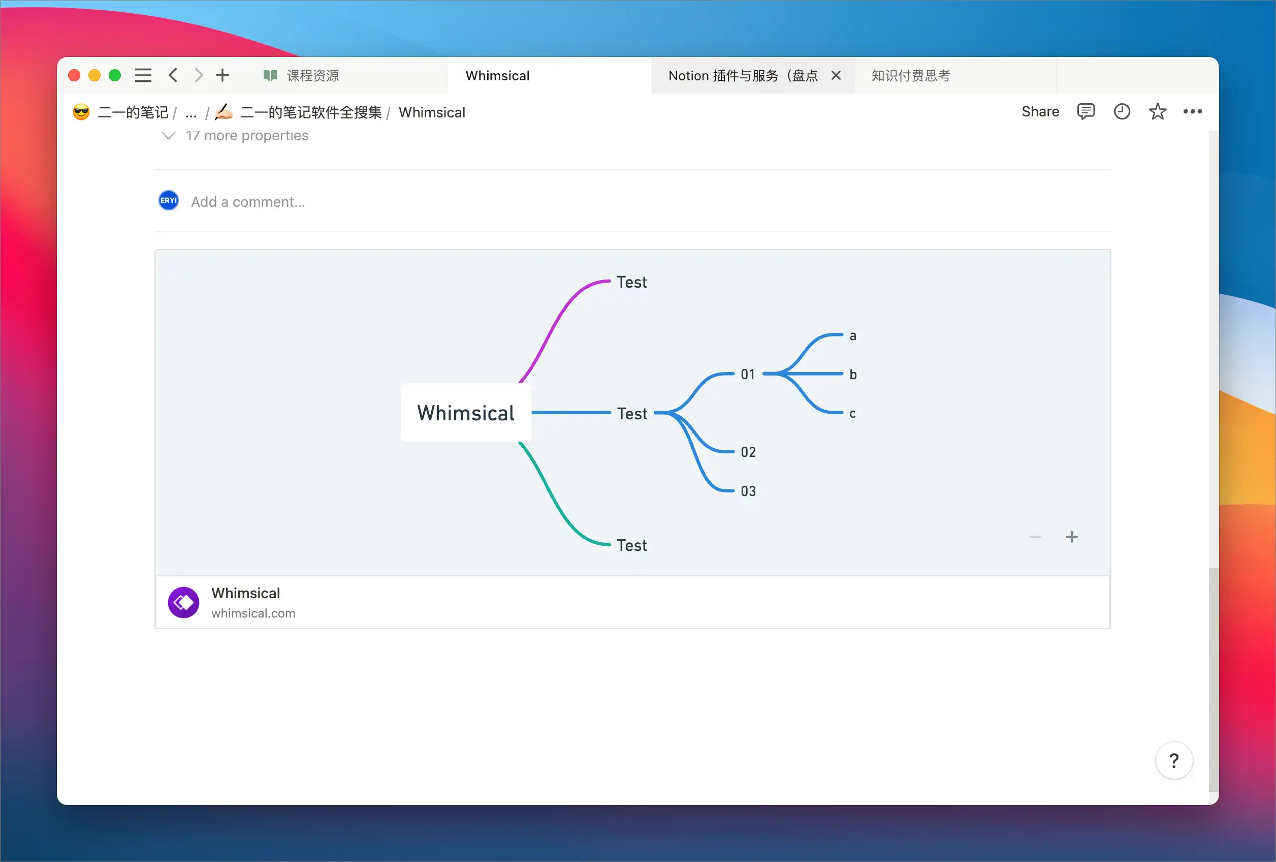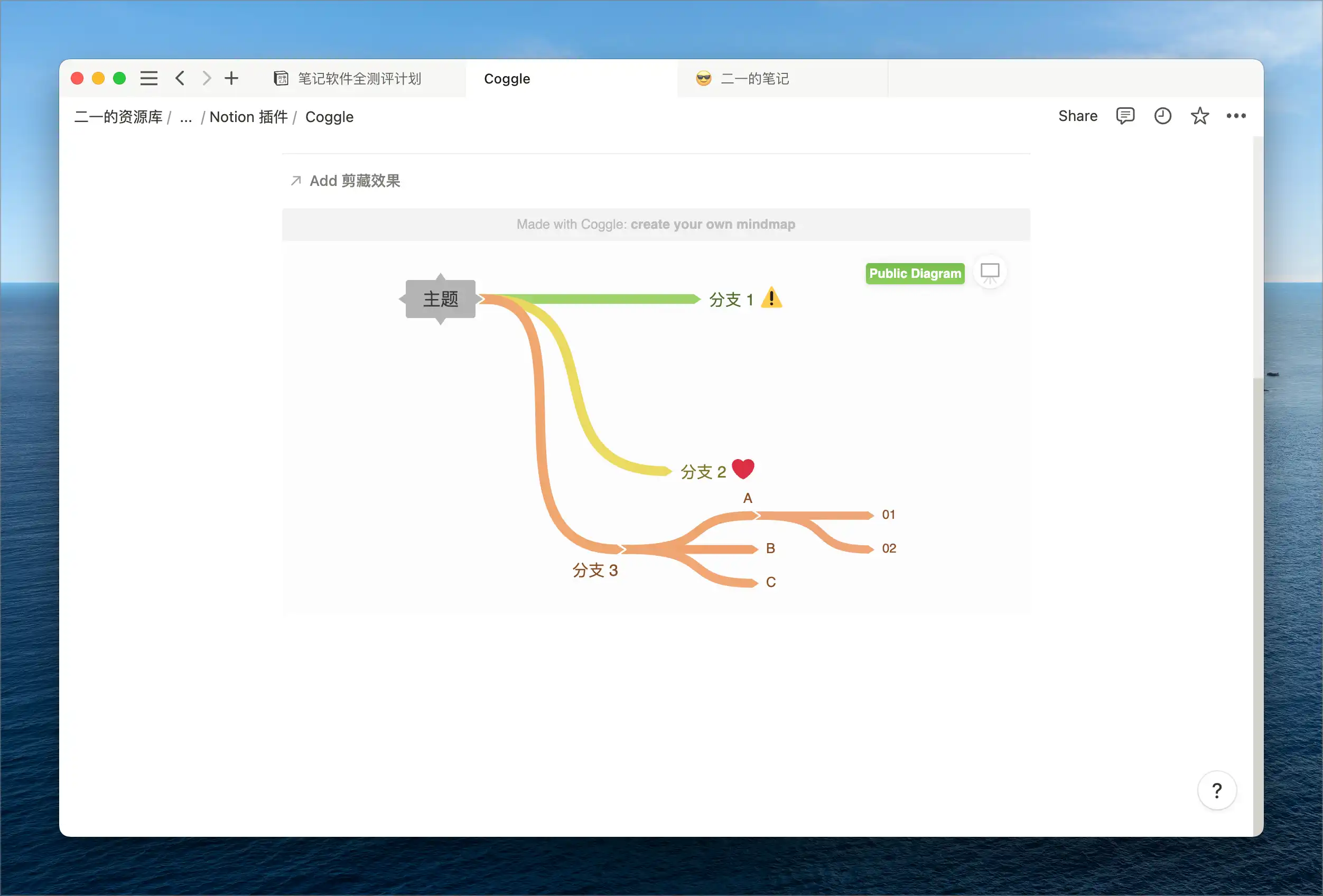 现阶段如果你一定要把思维导图放进 Notion 之中的话,比较可行的方案还是需要先用可在线发布的思维导图进行制作,然后将这份思维导图嵌入到 Notion 之中,例如这样: