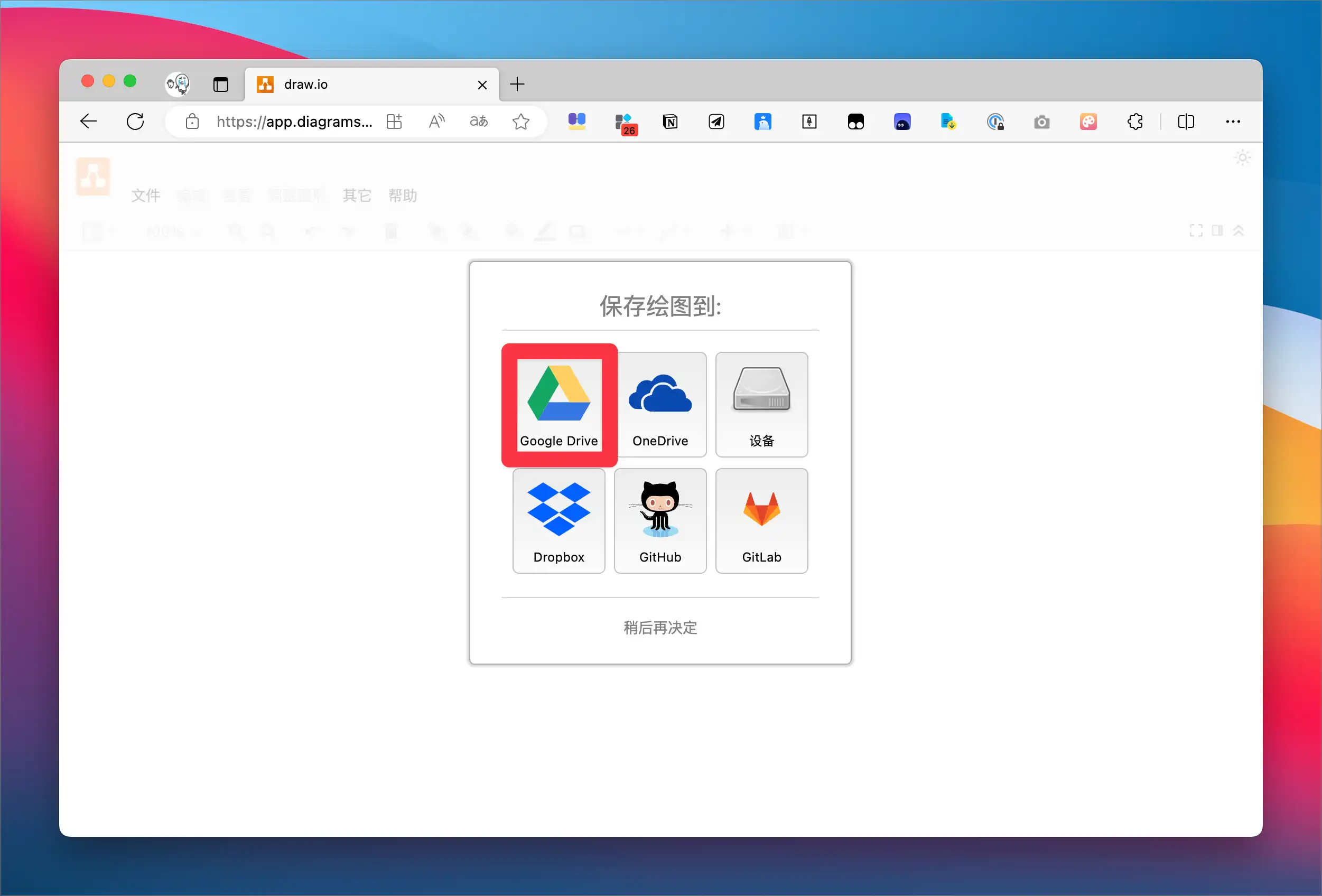 初次登录 Draw.io,它会提示你选择文件的存储位置,这意味着它只负责在线制图,而不负责存储文件。所以如果你只是在本地使用的话,可以选择存储于「设备」上,但如果你要将文件嵌入到 Notion 的话,你需要将文件的存储位置选择为谷歌硬盘: