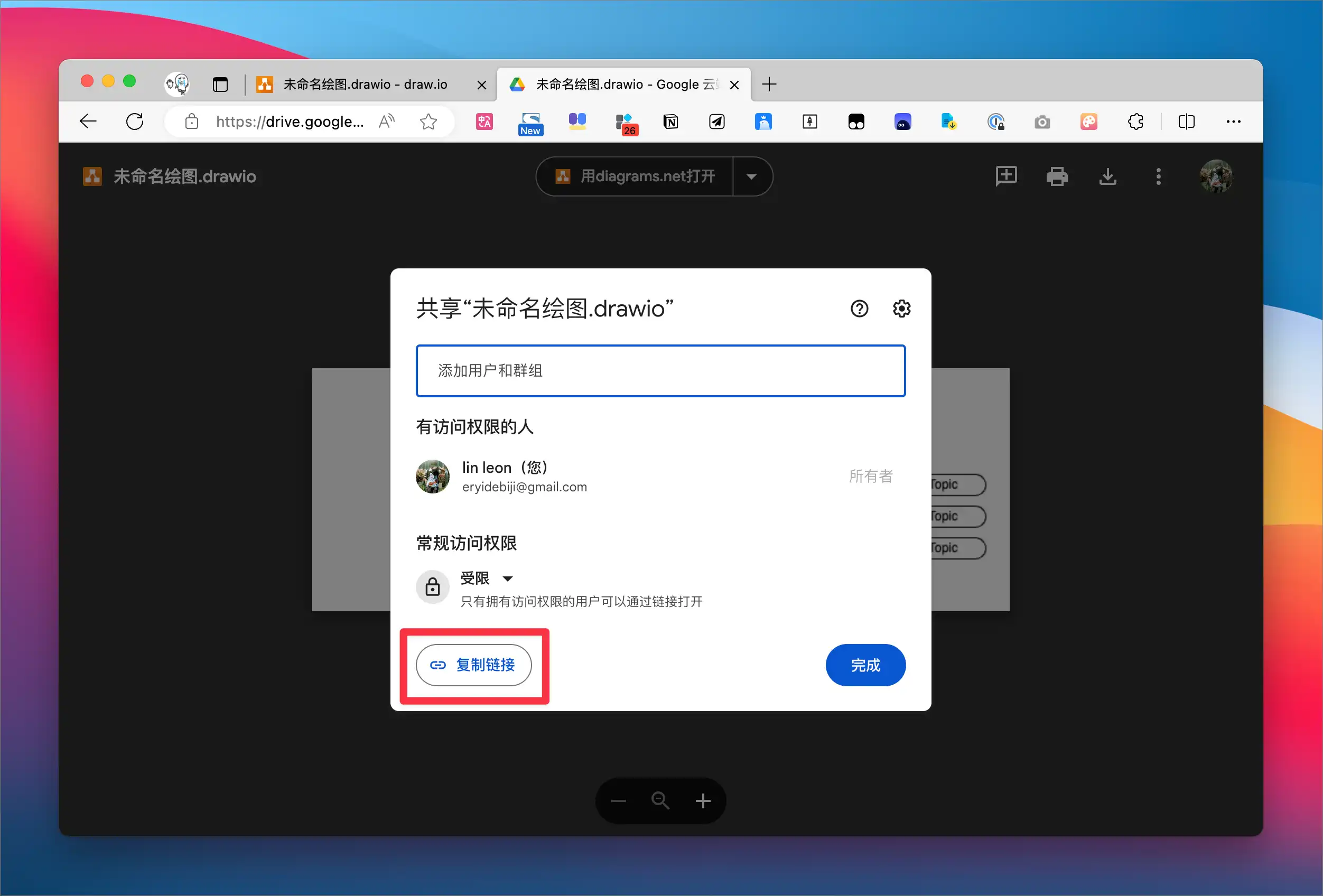 绘制完成后,点击右上角的「共享」按钮,然后在谷歌硬盘(Google Drive)上打开这份文件,就可以获取能够嵌入到 Notion 的链接了: