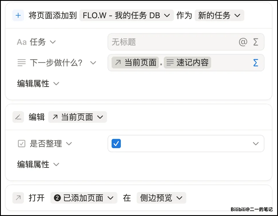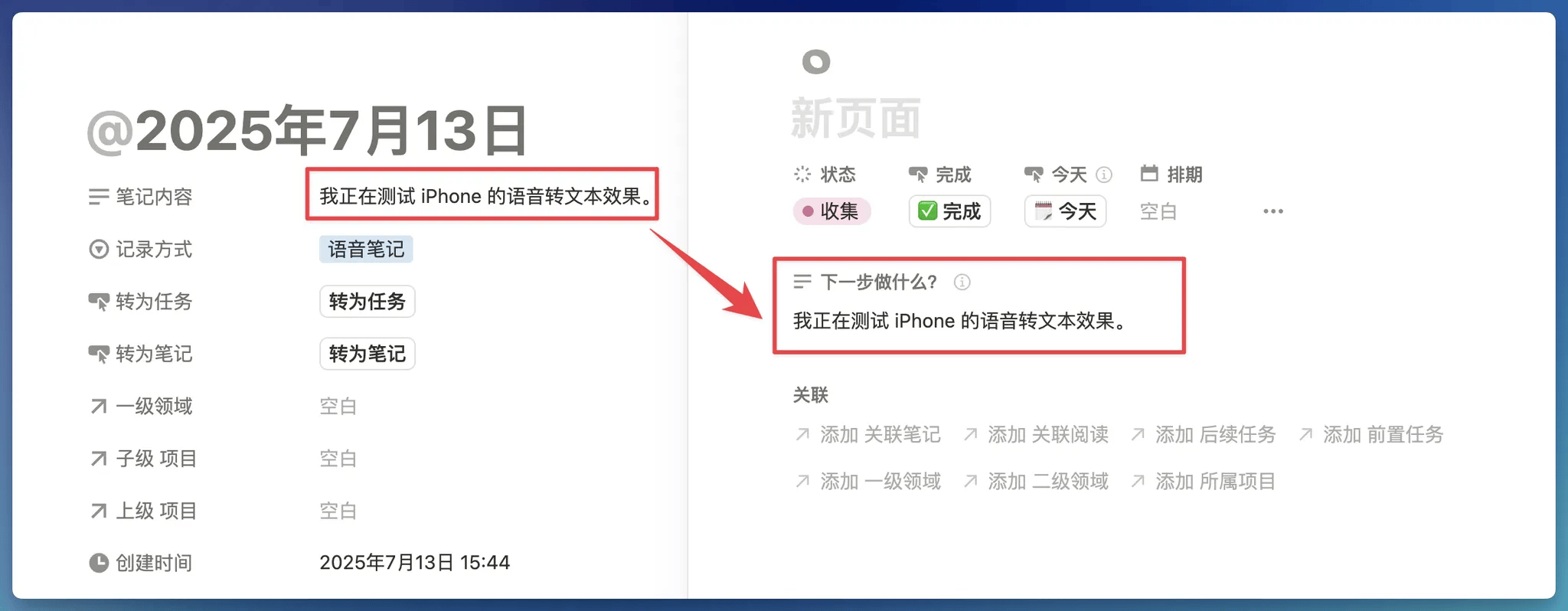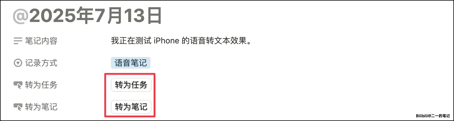 既然我们已经将语音以文本的形式存储到了 Notion 的数据库中,那么基于数据库的强大功能,我们就可以用数据库按钮,将当前语音笔记一键转化为正式的笔记,或者将其快速转化为一个任务。