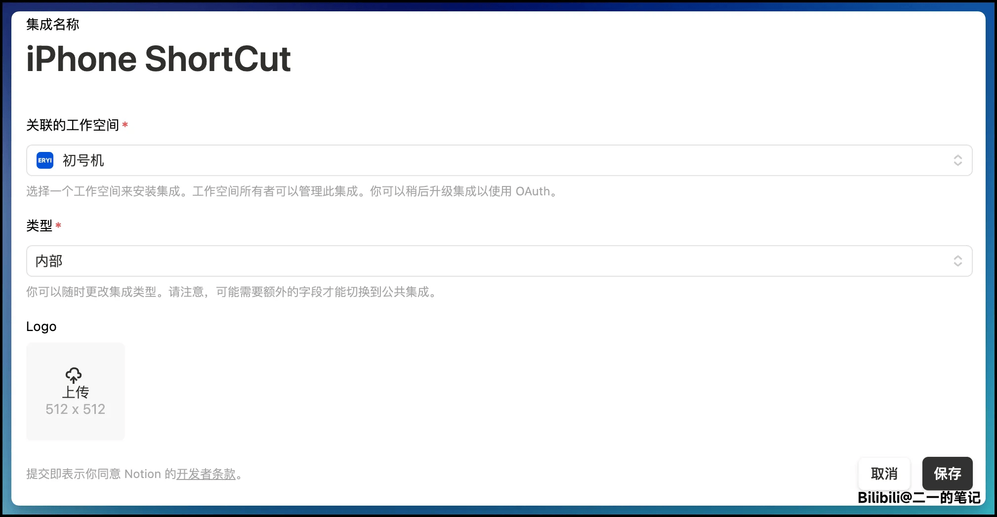 - 创建一个新的集成,可以自定义名称,关联到你的 Notion 空间,然后点击右下角保存按钮