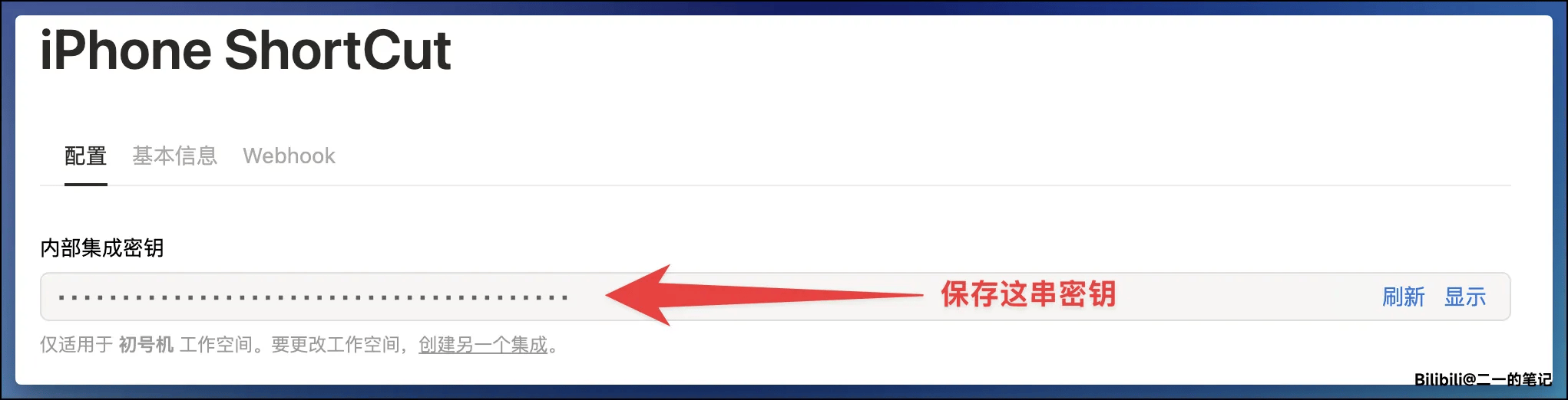 - 点击「配置集成设置」,获取「内部集成密钥」
