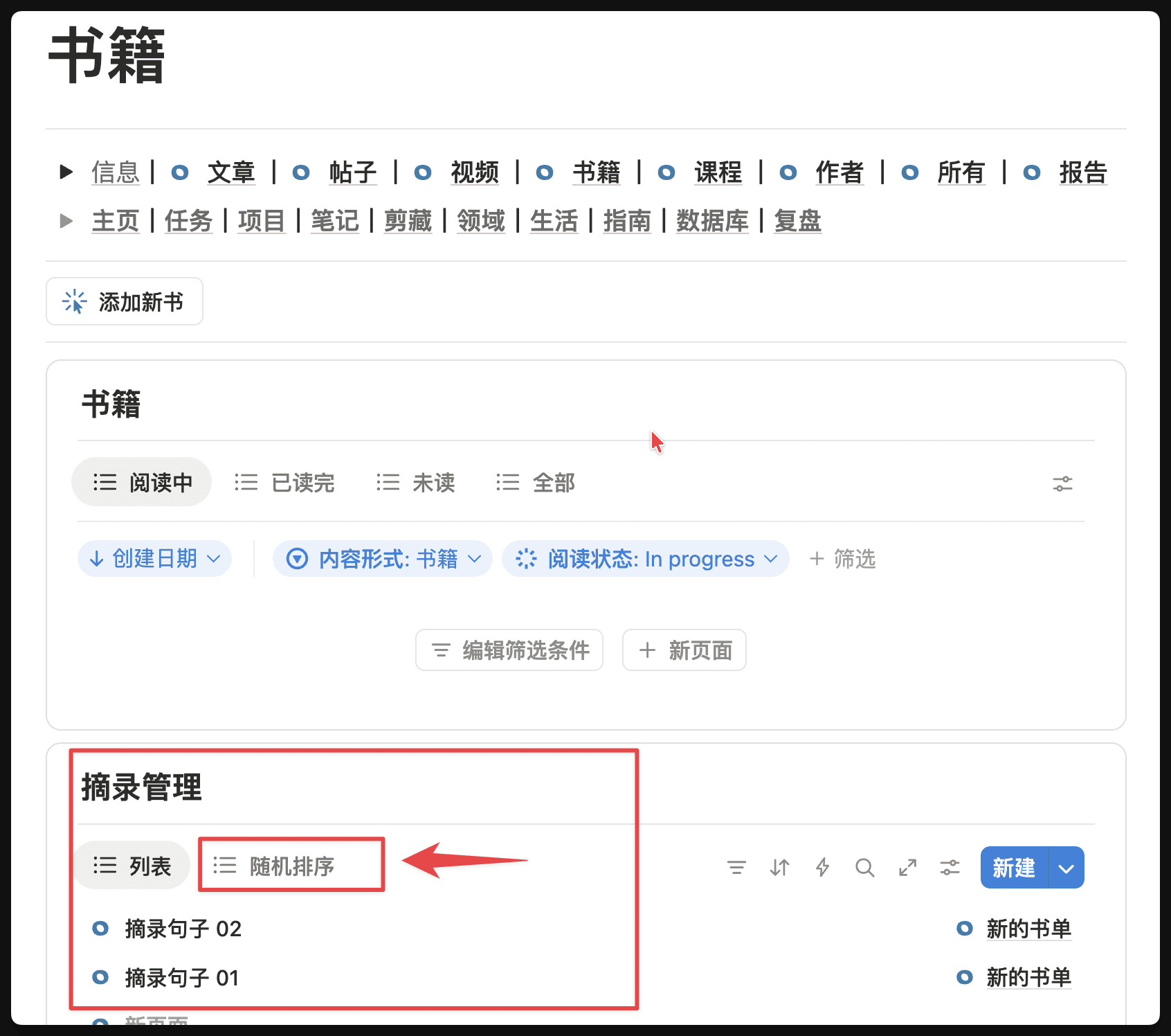 另外在【摘录】这个数据库里还有一个【随机排序】功能,可以将你的所有摘录进行随机排序,避免你每次看到都是同一个顺序。