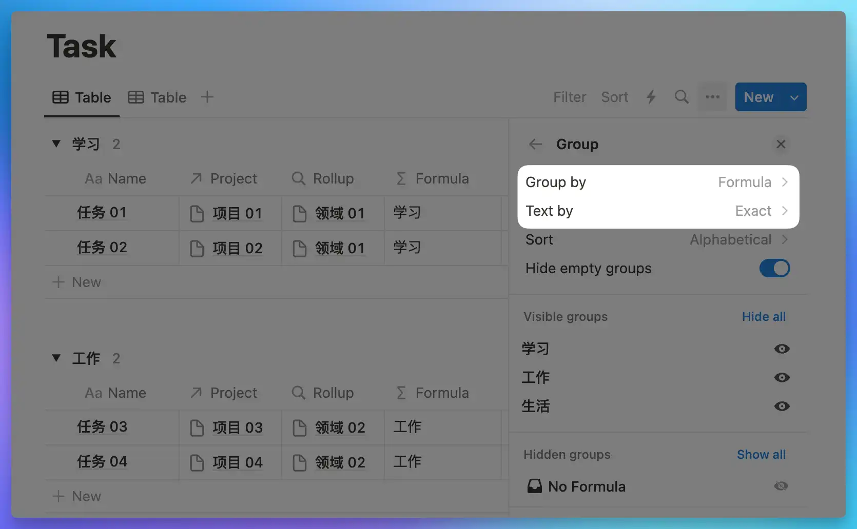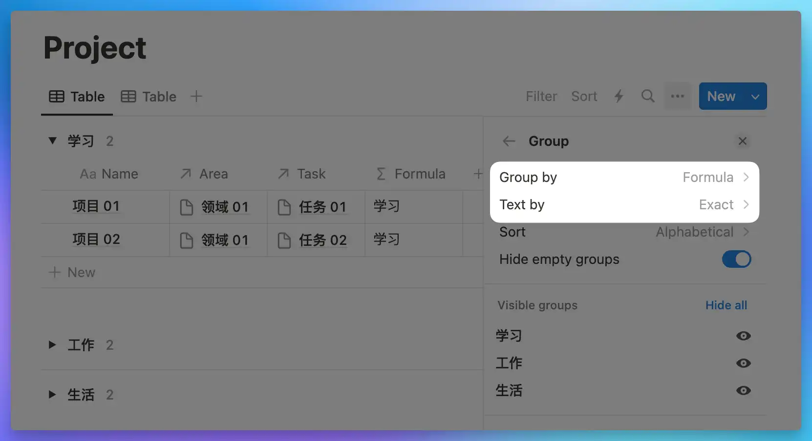 Add a Formula property in the Project database. Use the map function to look up the Select property value of the Area related to each Project. Since map returns a list (array format), which also cannot be grouped directly, you need to add a format function to convert the list into plain text: