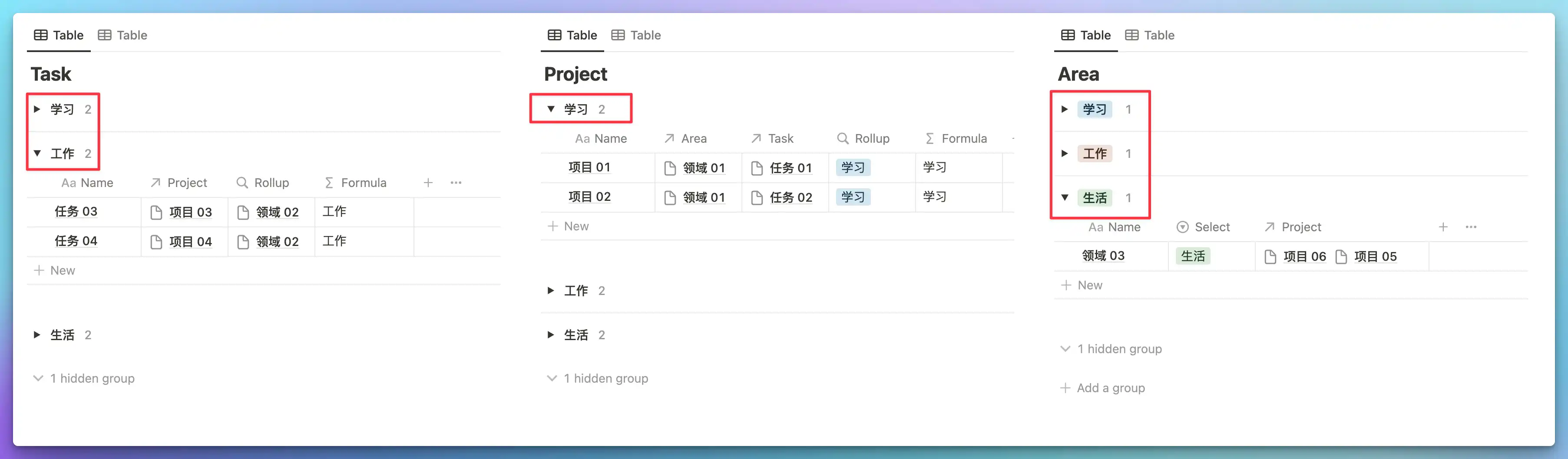 The question is: after assigning a tag like Work to "Area A" in the Area database, can the projects related to that area, and the tasks related to those projects, also automatically receive the Work tag? If so, it would be possible to share the same grouping standard (Group) across all three databases, as shown below: