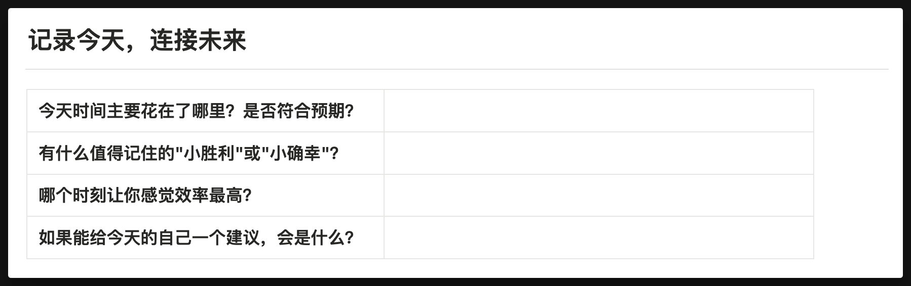 The fastest way for any productivity tool to deliver value is to use it to clear today's memory burden - that is, to record things you can't or don't want to forget right now in the simplest way possible with this tool, and then go do what you should be doing, because you no longer need to worry about forgetting. What runs counter to improving efficiency is actually spending too much time researching and imagining how much benefit productivity tools can bring you. Although this statement may discourage the majority of users who might purchase my Template on impulse, this ultimately represents my true perspective on tools. I don't intend to lie, and my Template will not have designs that are superficial and only increase anxiety.